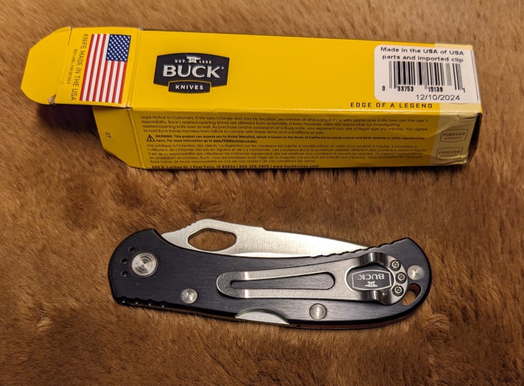 With strong enough bifocals, it was possible to glean much useful information from the product box. An American flag printed on the end of the box directed me to the label for details. The label informed me that the knife was “Made in the USA of USA parts and imported clip.”