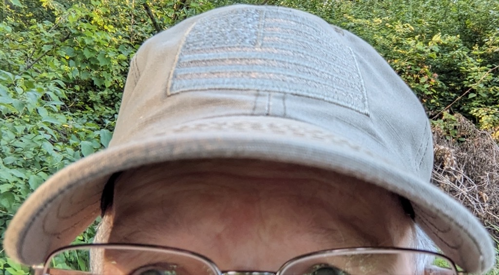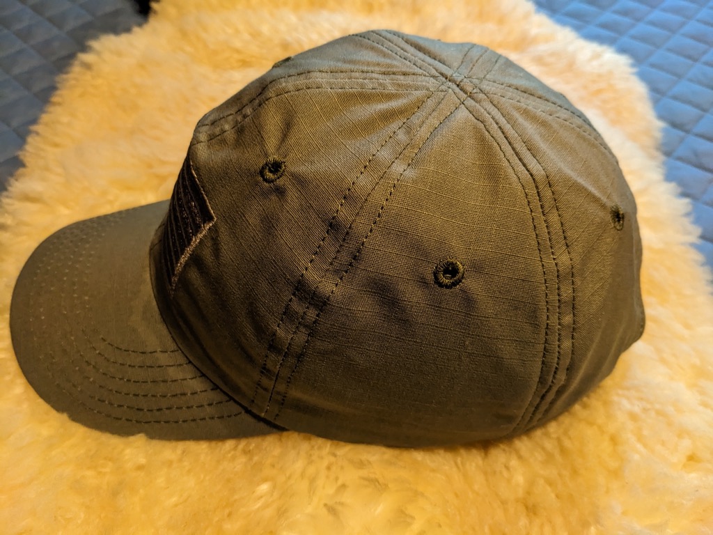 The range hat is similar to a baseball cap in that the round crown is composed of six main panels, and there is a bill-style brim in front. As mentioned above, unlike most baseball caps, there is no squatchee in the middle of the crown where the six panels come together. And there is no buckram supporting the front two panels. Those two front panels are attractively decorated with an embroidered tonal American flag patch.