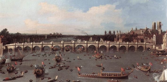 On May 20, 1736: Royal Approval was given by King George II to construct the original Westminster Bridge across the River Thames, in London. The 1747 painting above (titled “Westminster Bridge, with the Lord Mayor’s Procession on the Thames“) was by the Venetian artist Giovanni Antonio Canal (aka Canaletto.)