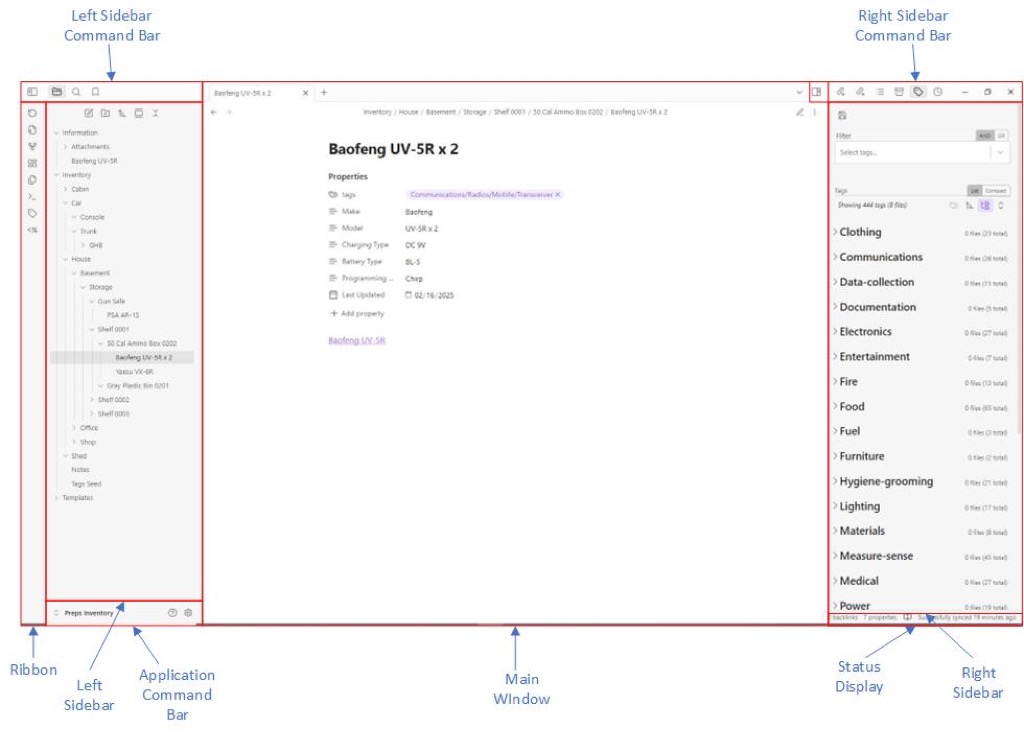 Next on the UI is the Main Window, which is where your inventory item notes will be displayed when you click on them in the Left Sidebar. In the example above this is a sample note for two Baofeng UV-5R radios. At the top of the main window is a tab bar which works like a web browser – you can have multiple notes or other things open at the same time and switch between them just by clicking on tabs.