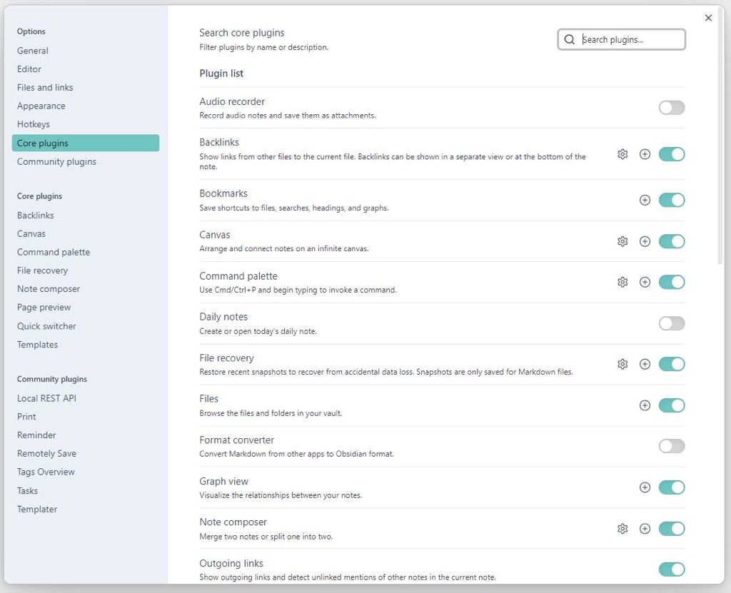 As you can see in the Options pop-up there are two categories of plugins – Core and Community. Core plugins are developed by the same people that write Obsidian. There are a couple of dozen of them available, and I use the following Core plugins in my inventory system: