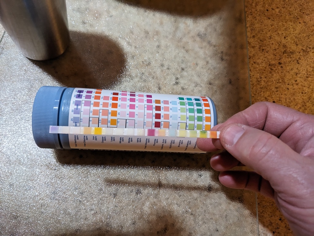 I ripped open one of the foil pouches and removed a test strip. Then I filled the plastic test tube supplied with the kit with water from the tap in the kitchen. I then dipped the test strip into the tube and removed it after two seconds. Next I waited an additional 15 seconds before comparing the test strip with the color chart on the side of the test strip storage bottle.