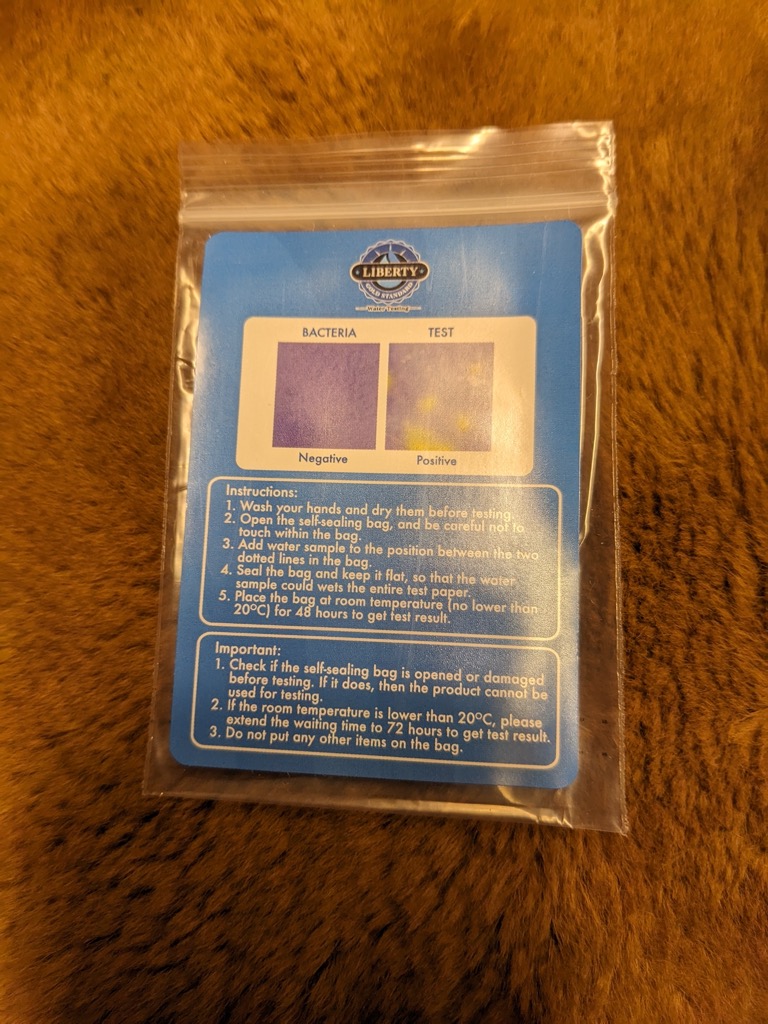 Next, I carefully followed the directions for performing the coliform bacteria test. I began by washing my hands thoroughly. Then I ran the water in the tap for two minutes. Next, I adjusted the flow from the tap to a slow trickle. I then opened one of the test bags, added water to the recommended level, and then resealed the bag. Finally, I laid the bag on a flat surface at room temperature and waited 48 hours. At the end of the test period, the kit was negative for the presence of coliform bacteria.