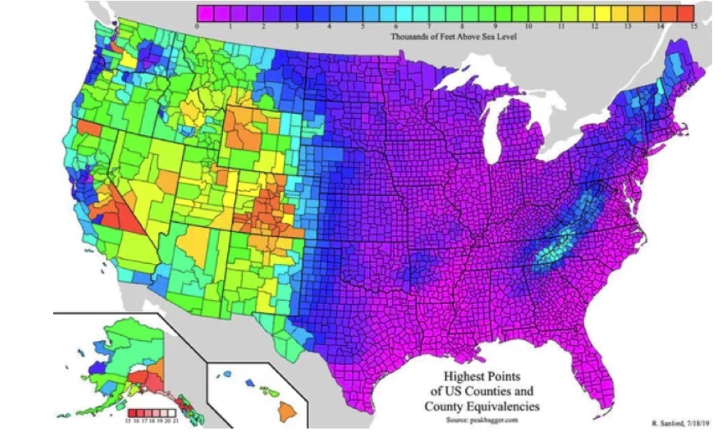 Today’s graphic: A map showing the highest natural elevation in each county in the United States. (Graphic courtesy of Peakbagger.com, via Reddit.)