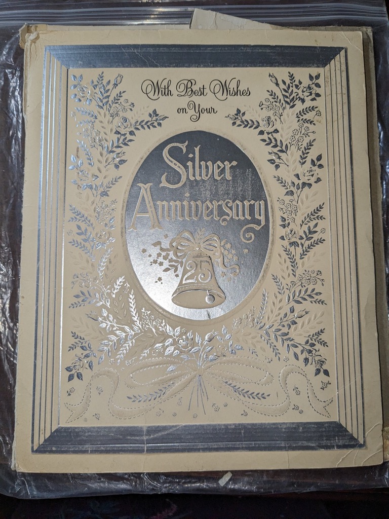Before I was ever born, in 1962, my Great Aunt and Uncle gave my grandparents a gift for their 25th wedding anniversary. Since the 25th is considered the ‘Silver’ Anniversary, they choose to give 25 silver dollars. They even found a lovely card designed for the occasion. At that time, as you may know, it was a one-to-one exchange of paper dollars for silver dollars. So, if my great Aunt and Uncle didn’t have 25 of these coins laying around the house, then they could’ve just gone to the bank and literally exchanged twenty-five single $1 paper American dollars, for the twenty-five $1 silver dollar coins they placed in the card.