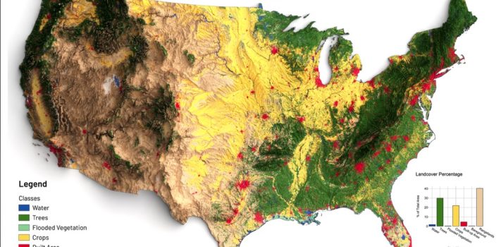 Today’s graphic: US Continental Land Cover. (USGS 2024 data, in a graphic courtesy of Reddit.)