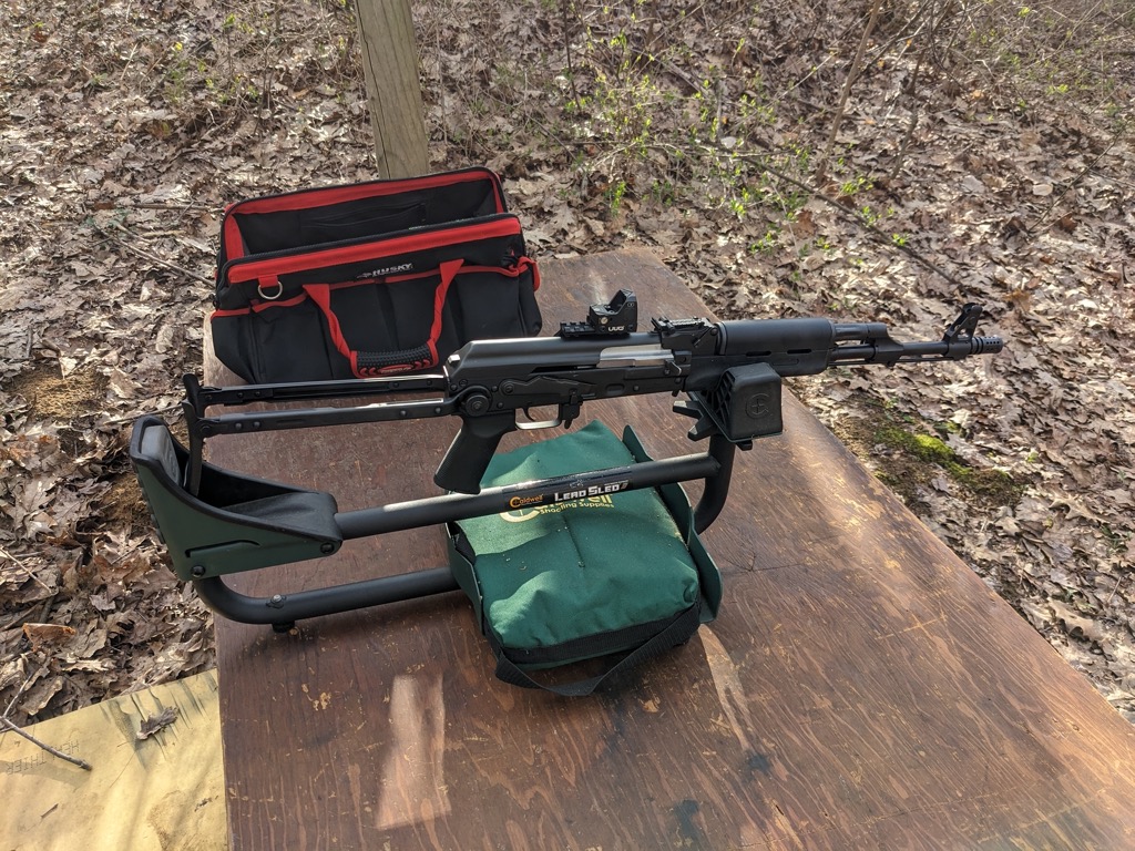 I put the rifle on a lead sled, and loaded a single round of TelaAmmo USA 124 grain FMJ steel case. The first shot was centered but about 11 inches low. Over the course of the next several shots and adjustments, I gradually walked the shots toward the center of the target.