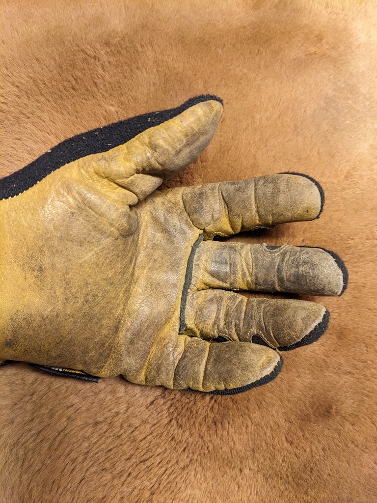 Over the course of time, the gloves acquired a patina of ground in dirt. That patina did not impact their performance in any way. The drum buffalo hide remained tough and supple throughout.