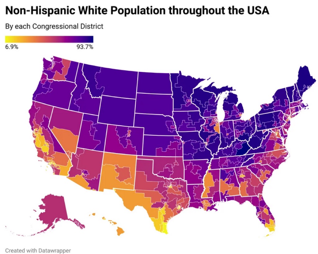 Today’s graphic: Non-Hispanic White Population in Each US Congressional District. (Graphic courtesy of Reddit.)