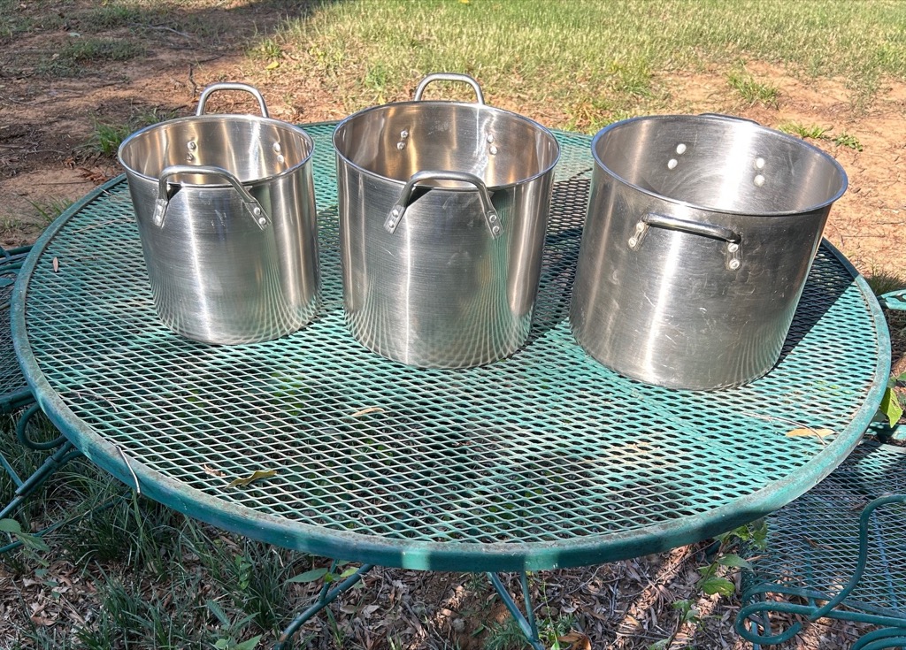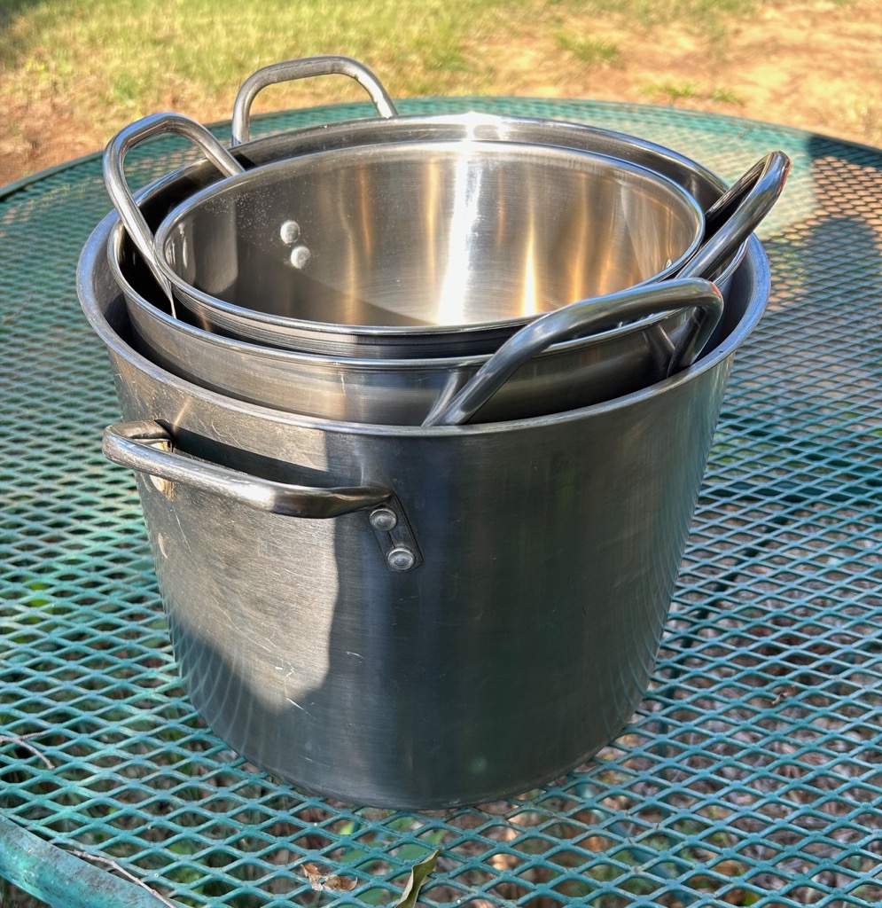Suitable tanks for parkerizing are not too hard to obtain for a lot of projects. They must be made of stainless steel and must be large enough to hold the parts you want to parkerize. If you want to refinish a handgun, for example, you can do a fine job using a small stainless pot for the actual parkerizing solution. Don’t use your home cooking kitchen pots for this work, get some dedicated tanks or pots.. A stainless steel kitchen pot from a thrift store is a good choice because they are foolproof, they last almost forever, come in various sizes, and are very stable on a heat source. The ones used here are stock pots from a national grocery chain. They were very inexpensive, they have lids, and they nest together to save space. (As shown.)