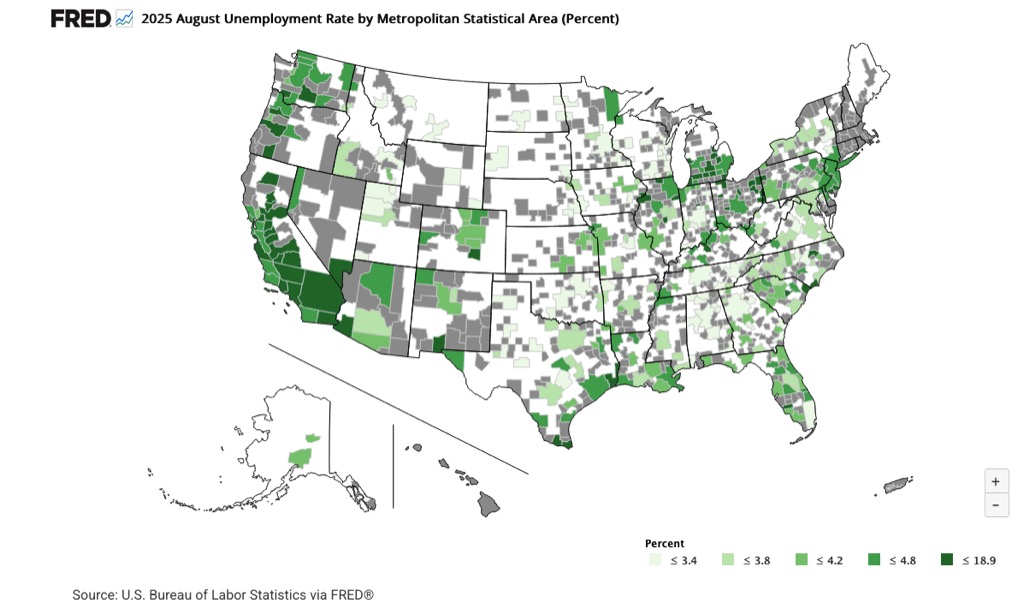 The map image below, showing Unemployment Rates, By County is from Bureau of Labor Statistics (BLS) data, posted for unrestricted use by the St. Louis Federal Reserve Bank. It is click-expandable.
