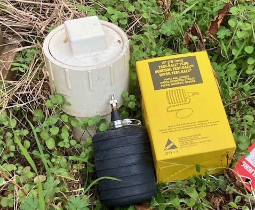 My first recommendation is to locate the septic line cleanout most building codes require to be within ten feet of a home’s foundation. With the xception of bathrooms in fully subterranean basements, removing the threaded cap plug should serve as the lowest outlet for a sewage backup and ensure that potential back flows occur outside of the home. Dropping a test ball down into the waste line, such as the one shown at left. Thus, you can add a level protection and prevent the accumulation of community waste from piling up around YOUR cleanout. These devices are essentially a heavy-duty rubber balloon that are positioned in the drain line (not the access fitting that has the removable plug) and inflated. Both the 3- and 4-inch models that I carry for demonstration require 13 PSI to wedge them in place. It is useful to use an air/tire chuck with an integral pressure gauge to inflate these bulbs in addition to a short air line extension hose to ensure the ball is inserted deeply enough in the line., Keep in mind that by using this method to prevent backflow, you also prevent further use of the home’s drain lines, too.