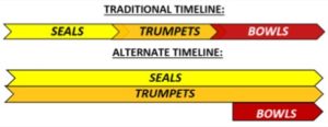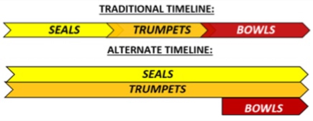 In the traditional timeline of the tribulation, the Seals, Trumpets and Bowls are in consecutive order. However, one cannot escape the fact that the Second Coming of Jesus is clearly stated at the end of the Seals, so there appears to be an overlap: