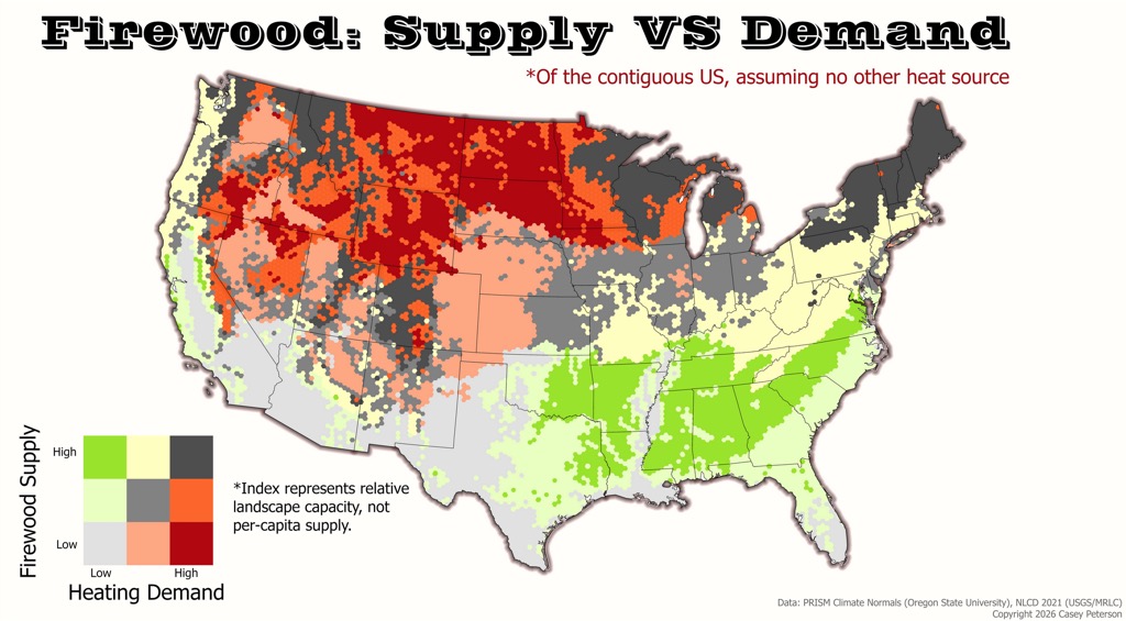 Today’s graphic: Firewood Supply Versus Demand. (Graphic courtesy of Reddit. Map by Casey Peterson, based on 2021 PRISM OSU climate data.)