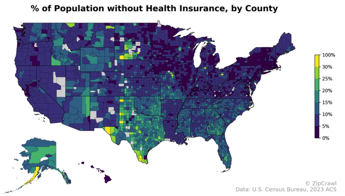 Today’s graphic: Percent of Population without Health Insurance, by County (U.S.). (Graphic courtesy of Reddit and ZipCrawl.)