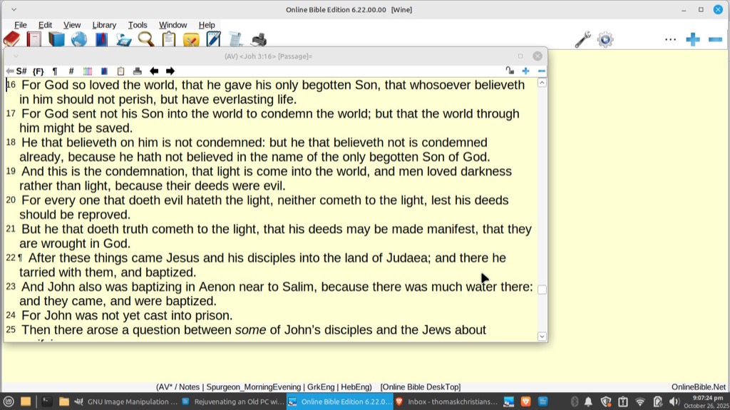 Back on the Toshiba, I noted that StepBible lacked Online Bible’s cross-reference capabilities. I decided to try to install Online Bible on the Toshiba using Wine, a Linux Windows emulator. The Wine installation took about 10 minutes, but I could not figure out how to use it to install Online Bible.