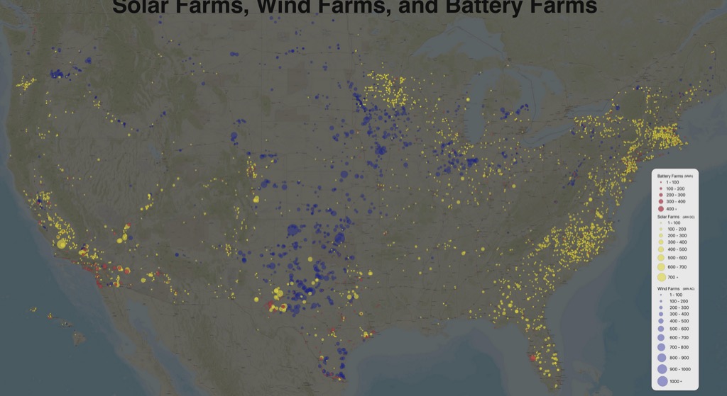 In Economics & Investing Media of the Week we feature photos, charts, graphs, maps, video links, and news items of interest to preppers. This week, a map of solar farms, wind farms, and battery farms in the United States.