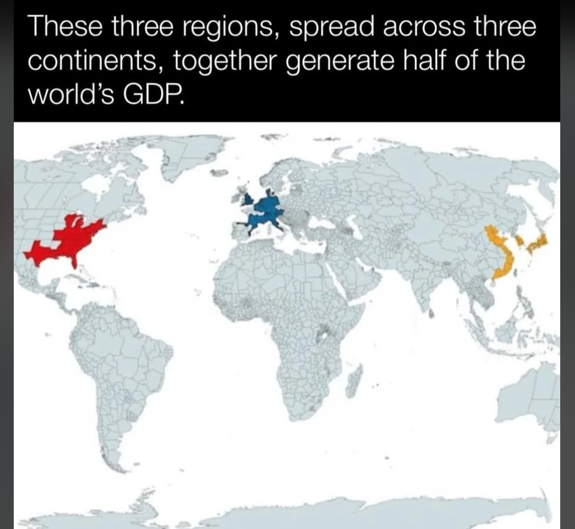 Today’s graphic: Global GDP Clusters. These three regions, spread across three continents, together generate half of the world’s GDP  (Graphic courtesy of Reddit.)