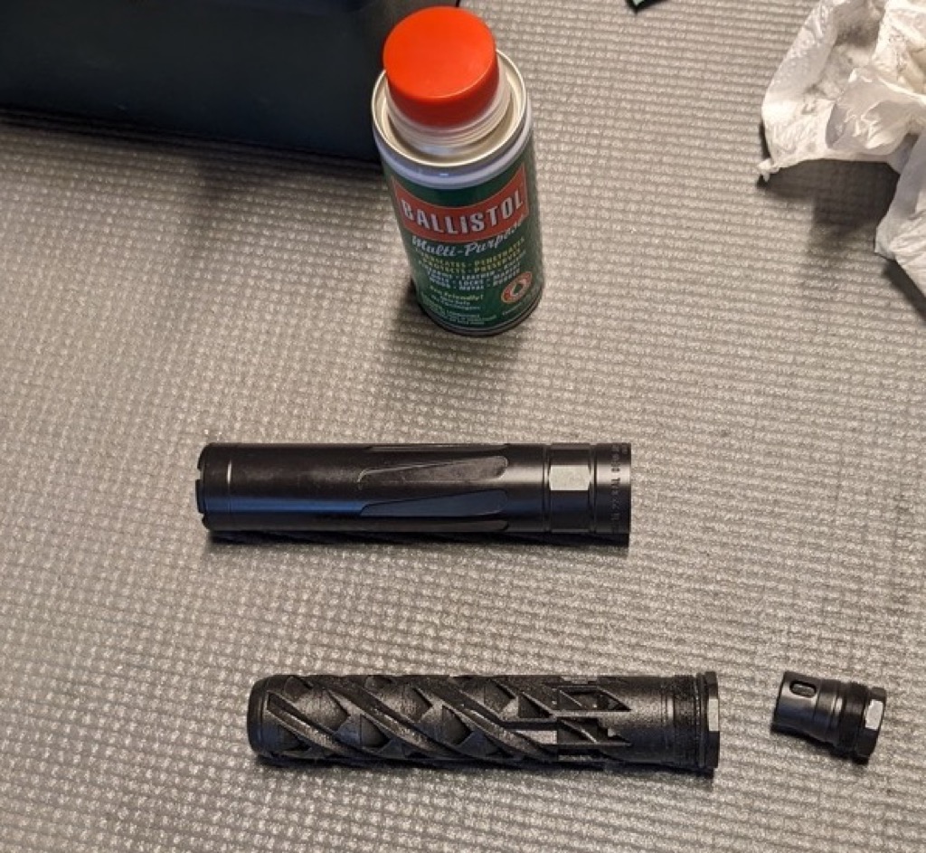 The instructions for my new Dead Air RXD22Ti Silencer specified that I should use a non-toxic, water-soluble, biodegradable product when cleaning the silencer. Ballistol fit that description, so I put it to work. I disassembled the silencer and scrubbed the various components with a toothbrush dipped in Ballistol. I also ran a Ballistol patch through the bore using a cleaning rod and jag. After scrubbing, I wiped away as much Ballistol as possible using a clean paper towel for parts that were accessible outside of the bore and a dry patch for the inside of the bore. I then reassembled the silencer.