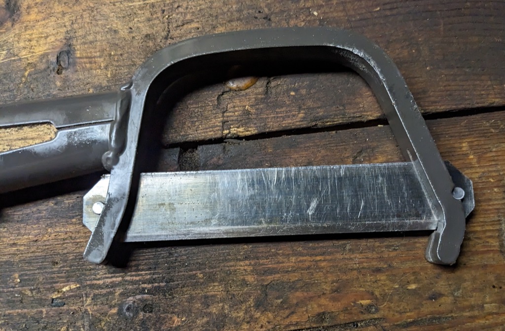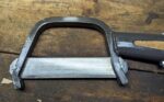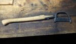 Once the blade was removed, I could clean the blade and the ends of the bow more thoroughly. To reinsert the blade, I just reinserted the bow in the vise, pulled the handle toward the open end of the bow, and reinserted the blade into the bottom of the bow. I then oiled the blade and bow, and hung the clearing axe back on the wall.